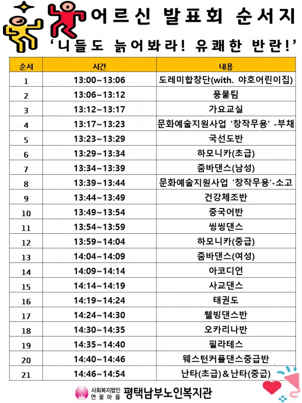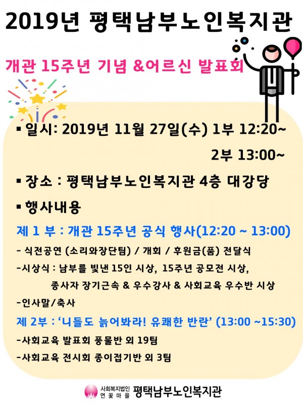 (행사)2019년 평택남부노인복지관 개관 15주년 기념&어르신 발표회'니들도 늙어봐라!유쾌한 반란' 행사안내 페이지 정보 작성일19-11-14 14:47 조회1,487회 댓글0건 관련링크 이전글 다음글 목록 본문 2019년도 평택남부노인복지관 개관 15주년 기념&어르신 발표회'니들도 늙어봐라!유쾌한 반란'많은 참여부탁드립니다. 댓글목록 등록된 댓글이 없습니다. 이전글 다음글 목록