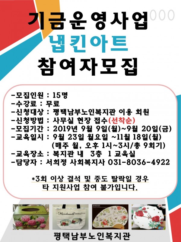 (사회교육) 기금운영사업 냅킨아트 참여자모집 페이지 정보 작성일19-09-09 09:41 조회1,392회 댓글0건 관련링크 이전글 다음글 목록 본문 많은 참여 부탁드립니다. 댓글목록 등록된 댓글이 없습니다. 이전글 다음글 목록