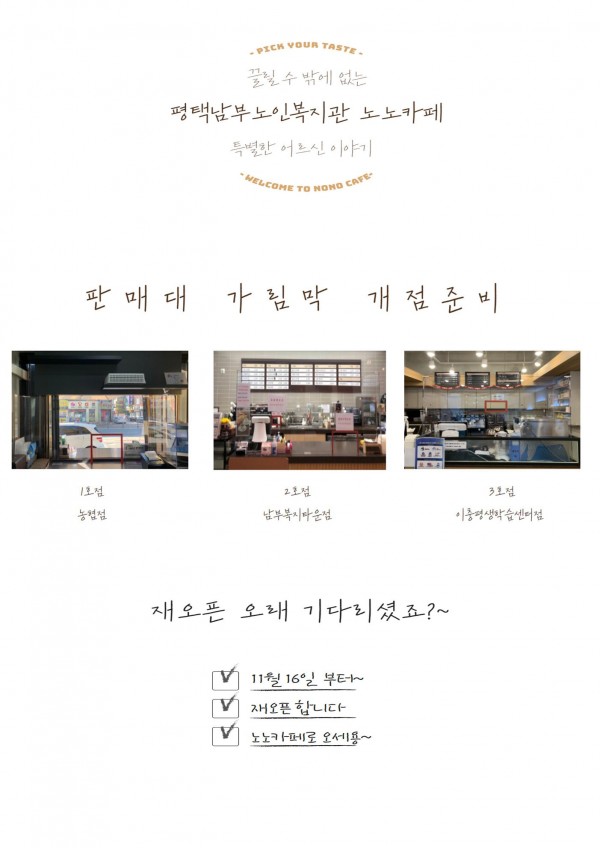 장기관 휴관으로 휴점으로 진행하였던 노노카페 농협점, 남부복지타운점, 이충 평생학습센터점에서 재개점을 통해 정상운영을 진행하게 되었습니다~