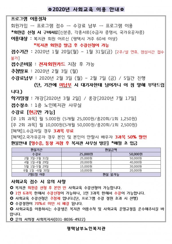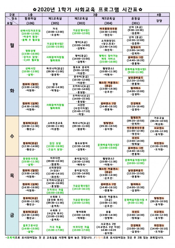 (사회교육) 2020년 시간표 및 사회교육 이용 안내 페이지 정보 작성일19-12-30 16:41 조회1,603회 댓글0건 관련링크 이전글 다음글 목록 본문 *많은 이용 부탁드립니다. 댓글목록 등록된 댓글이 없습니다. 이전글 다음글 목록
