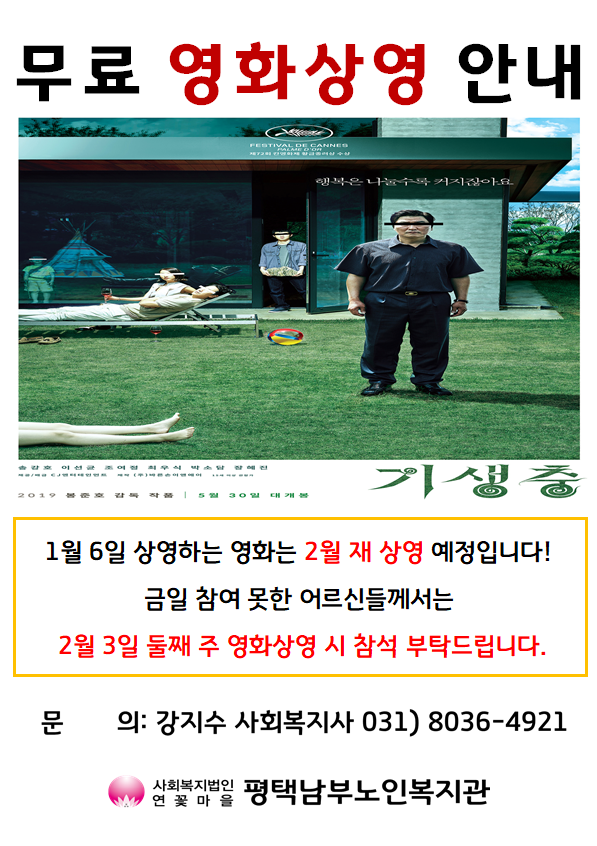 1월 둘째주 상영 영화 "기생충" 은 2월 둘째주 (2월 10일)에 재 상영 할 예정입니다.
