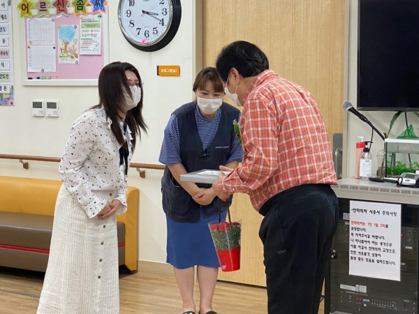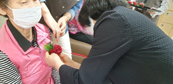 -내용: 어버이 날을 맞아 주간보호센터 이용 어르신들께 직접 만든 카네이션을 달아드리고, 기념 선물을 증정해 드렸습니다. 즐겁고 기쁜 날이 되셨기를 바랍니다.