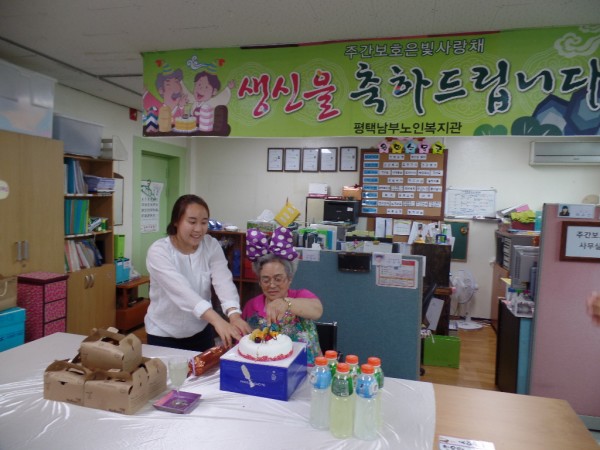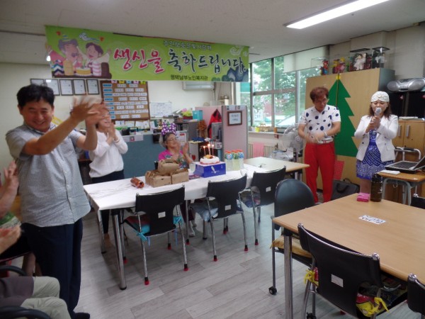 *내용: 주간보호센터에서는 7월 생신잔치가 진행되었습니다. 생신케이크,맛있는 음식과 함께한 흥겨운 노래는 생신자 어르신과 축하해 주시는 어르신 모두에게 즐거운 시간이 었습니다.