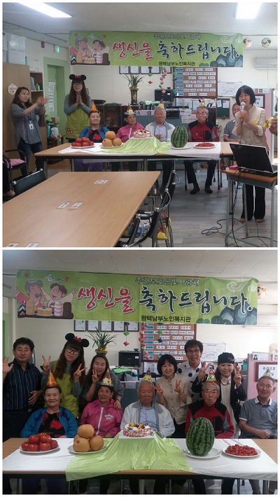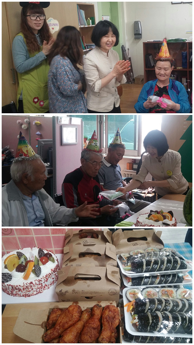 2015년 5월 한운택,황월선,이봉우,김동석,김경순어르신의 생신잔치를 진행하였습니다. 생신잔치 행사를 위해 관장님께서 직접 생신선물전달식과 덕담을 해주시고 특별깜짝공연으로 축하곡을 열창해주셨습니다. 가요교실 김라희, 최한도 강사님들. 흥겨운 진행으로 신명나는 자리를 만들어주셔서 감사합니다. 생신 음식으로는 한꼬마 김밥, 교촌치킨 비전점, 동방재단, 파리바게뜨 덕동점, 이 외 많은 관심과 후원 지원해주시는 분들께 진심으로 감사드립니다. 지속적인 후원관심 부탁드립니다.