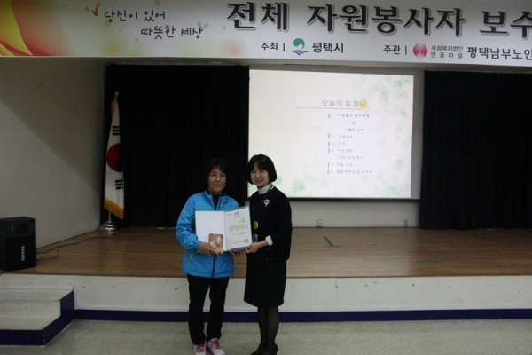 개인 봉사팀 성명순 회장에게는 한국사회복지협의회의 "2014년 자원봉사왕"에게 수여되는 인증서와