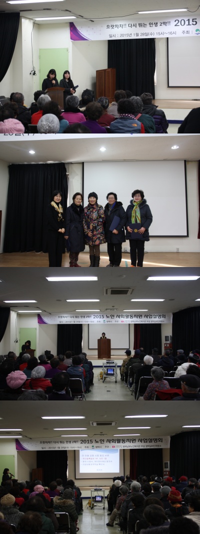 내용: 2015년 노인사회활동지원 사업설명회를 진행하였습니다. 사회활동지원사업에 관심을 갖고 계신 지역 어르신 137명이 참석해 주셔서 사업에 대한 안내 및 일정을 공지하는 시간이였습니다.