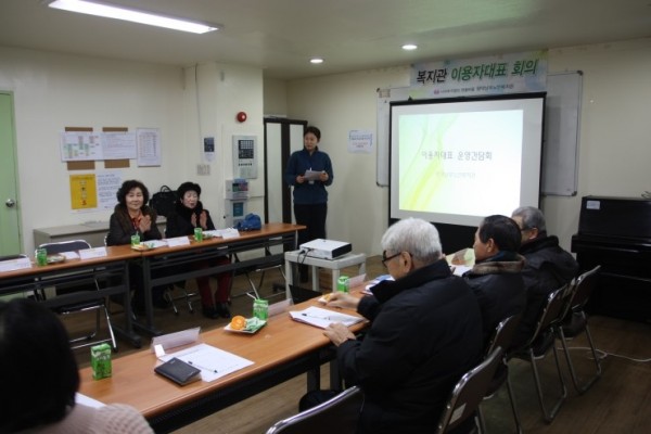 ※내용 : 복지관에서는 이용자대표회 회장 외 9명의 회원을 대상으로 하반기 이용자대표회 이용간담회를 실시하였으며 복지관 2~4분기 사업보고 및 기타 사업별 의견수렴을 통하여 이용자가 보다 편리하고 유익하게 보낼 수 있는 여가선용 기관으로서의 발전방향을 의논하였습니다.