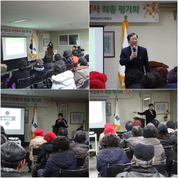 어르신 자원봉사 활동 마무리 및 욕구 만족도 결과 보고를 위한 실뱅 최종 평가회를 진행하였습니다. 올 한해 열심히 자원봉사 해주신 분들중 65명 정도의 어르신들이 참석하셔서 함께 의견을 나누는 시간이였습니다.