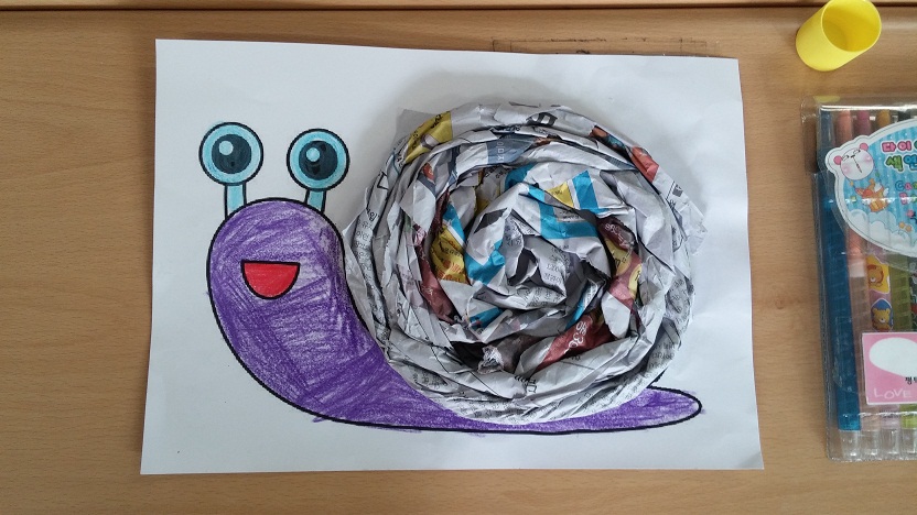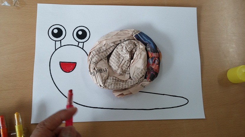 2.달팽이 집을 신문지를 돌돌 말아 풀을 발라 붙인다.