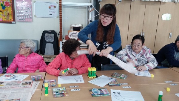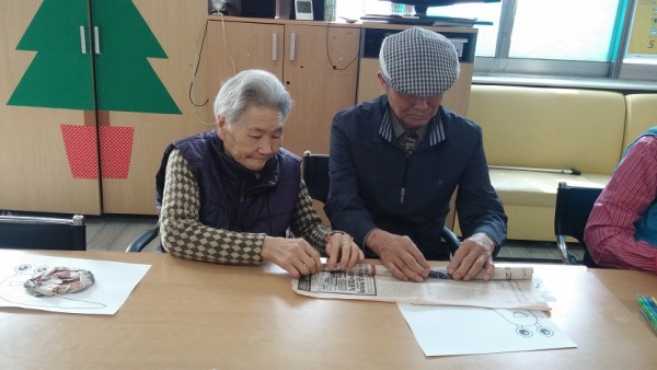 손이 자유롭지 못하시거나 혼자서는 어려우신분들은 두분이 협동하여 함께 신문지를 말으시고 손가락의 운집력을 이용하여 자극을 줄수 있도록 한다. '누구누구 달팽이집이 더 큰가?' 달팽이 주인은 달팽이의 이름을 지어주도록 한다.