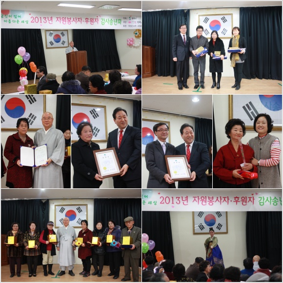 5. 내용 : 복지관에서는 2013년 한해동안 아낌없는 후원과 봉사를 해주신 분들을 모시고 금일 오후12시 복지관2층강당에서 직원공연 사물놀이와 무용공연, 수상식, 오찬 순으로 2013년 자원봉사자, 후원자 감사송년회가 진행되었습니다. 한해동안 도움주신 모든분들게 감사인사드리며 2013년 잘 마무리하시고 힘찬 새해 맞이하시길 바랍니다.