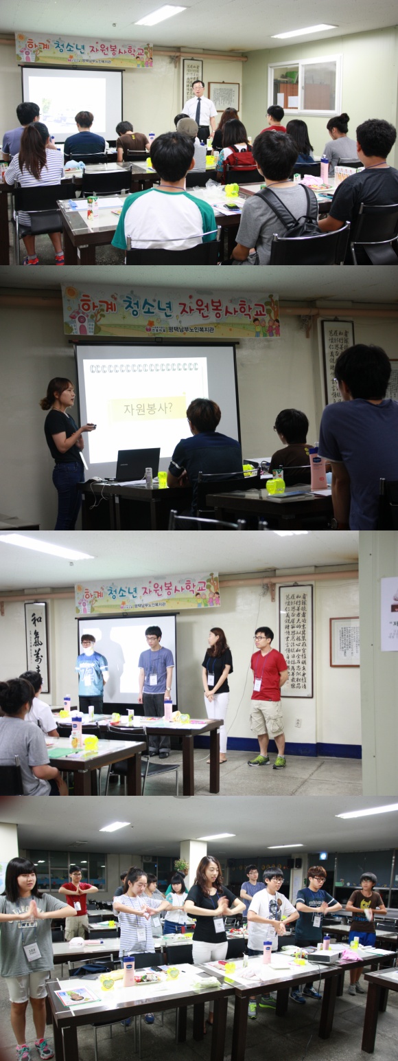 ■ 프로그램소개 : (1~3세대 통합) 홀몸어르신과의 결연봉사활동인 '한지붕,새(新)가족'이 7월 22일 오리엔테이션을 시작으로, 재가어르신댁에서 다양한 놀이프로그램과 함께 청소년들의 봉사활동이 펼쳐지고 있습니다. 청소년자원봉사학교는 청소년들의 봉사활동에 관한 내적동기를 강화하고자 연2회(하계,동계) 방학을 맞이하여 복지관에서 실시되는 특화봉사프로그램입니다.^^