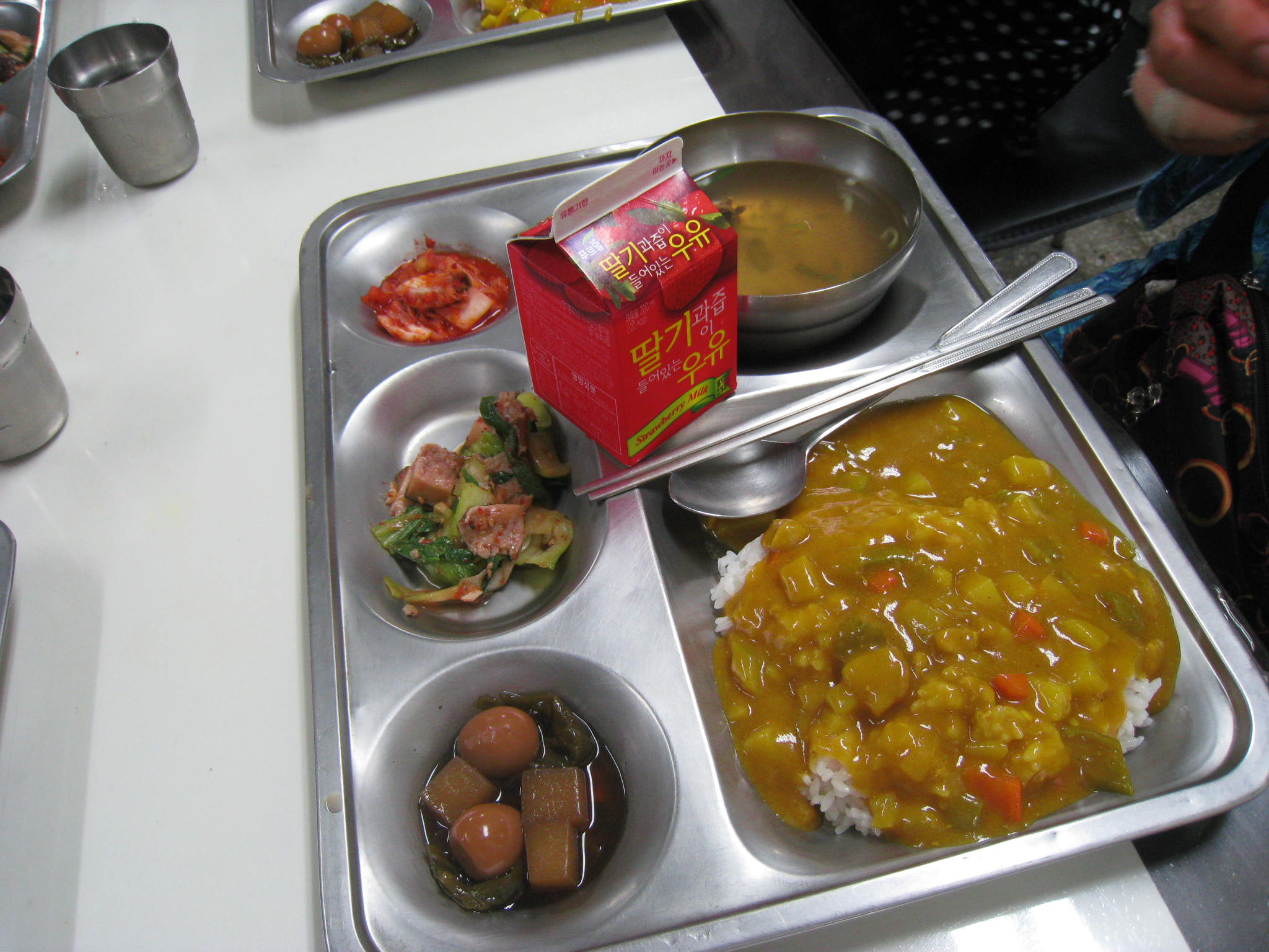 (식단: 카레밥, 홍합탕, 배추김치, 곤약메츠리꽈리, 표고파프리카, 우유)