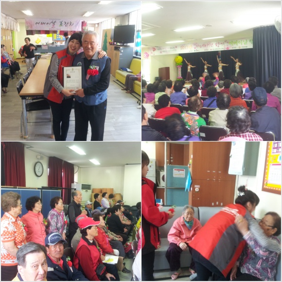 2013.5.8 주간보호센터에서는 어버이날을 맞이하여 행사를 진행하였습니다. 맛잇는 특식과 정성스런 선물을 준비하여 증정하여 드리고 카네이숀을 달아드리며 꼬옥 안아드리기를 하였습니다. 어르신들을 대표하여 주간보호센터내에서 일등어버이상을 시상하였고 강당에서 진행된 복지과에서 주관하는 어버이행사에도 참관하여 관장님, 시장(사모)님 축사및 밸리 댄스공연을 관람하실 수있어서 뜻깊은 하루가 되었습니다.