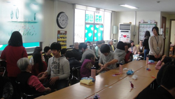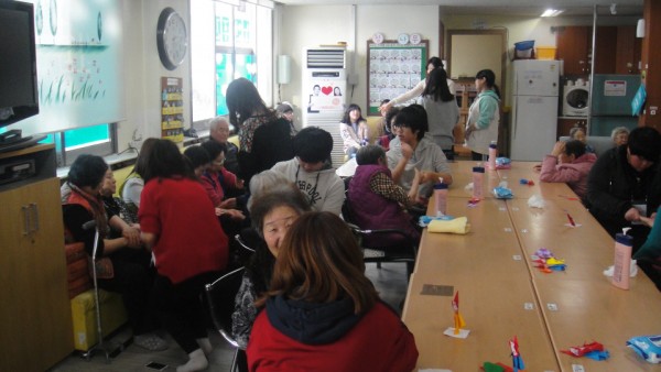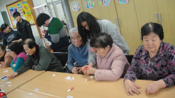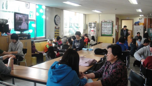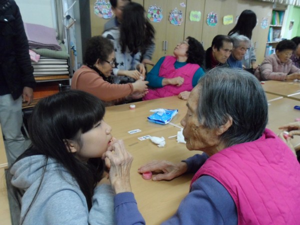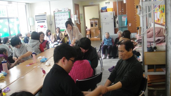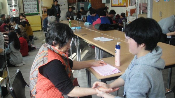 많은 자원봉사 친구들이 들어와서 인사를 하니 처음에는 어르신들이 어리둥절 하셨지만 어르신에게 손마사지를 해드리며 말벗도 해드리고 꾸준히 손마사지를 하러 와서 어르신들도 자원봉사 학생들을 기다리고 학생들을 맞을 준비도 먼저 손을 씻고 학생들 앉을 자리까지 만들어 주셨습니다.