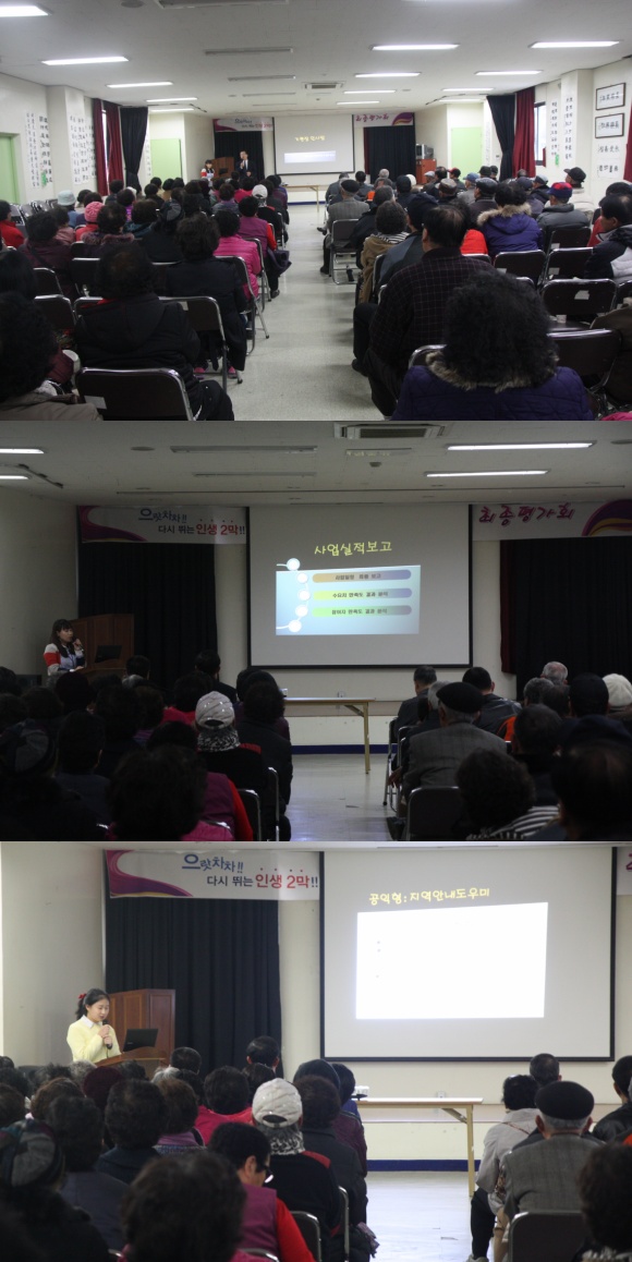 * 내 용 : 2012년 노인일자리사업 최종평가회가 11월 16일에 진행됐습니다. 노인일자리 참여자 120명이 참여한 가운데 기관장 인사말, 사업실적최종보고, 동영상관람, 사례관리, 건의사항의 순으로 식이 진행됐습니다. 마지막 까지 노인일자리사업에 참여해주신 어르신들께 감사의 말씀 전합니다.