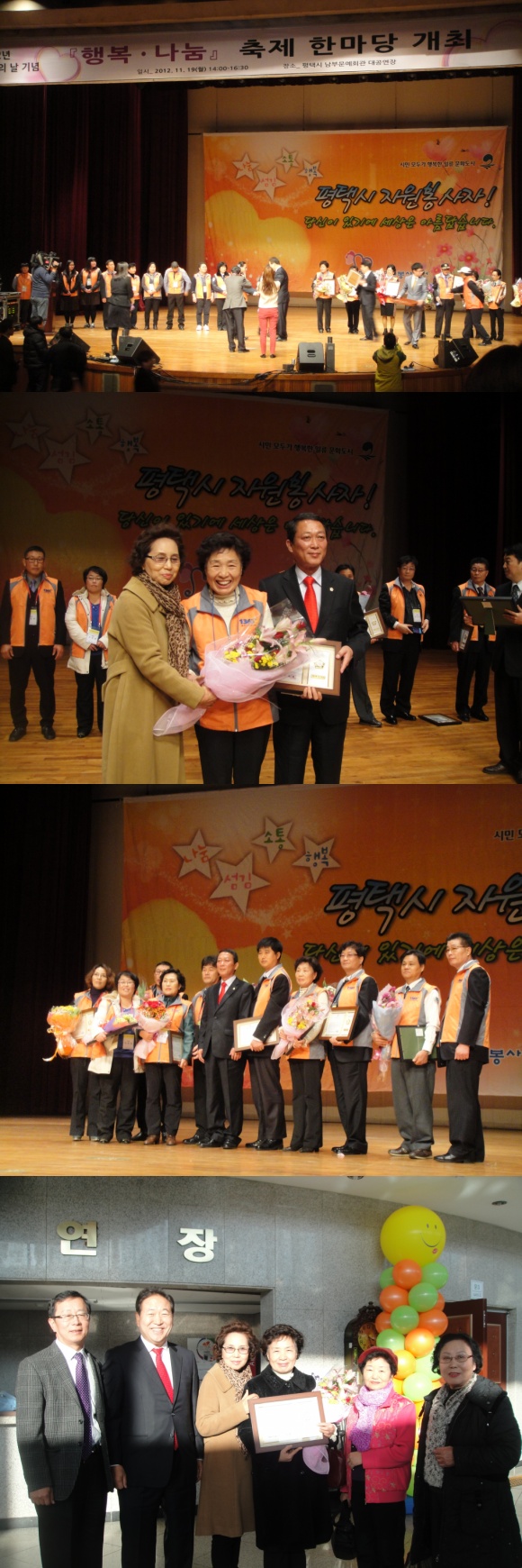 *내 용: 평택시 자원봉사센터에서 개최한 자원봉사의 날 기념 행사에서 노재사어르신께서 시의회 의장상을 수상하셨습니다. 항상 밝은 미소와 열정적인 마음으로 봉사에 임해주시는 노재사 어르신께 축하와 감사의 마음을 전하고 싶습니다.