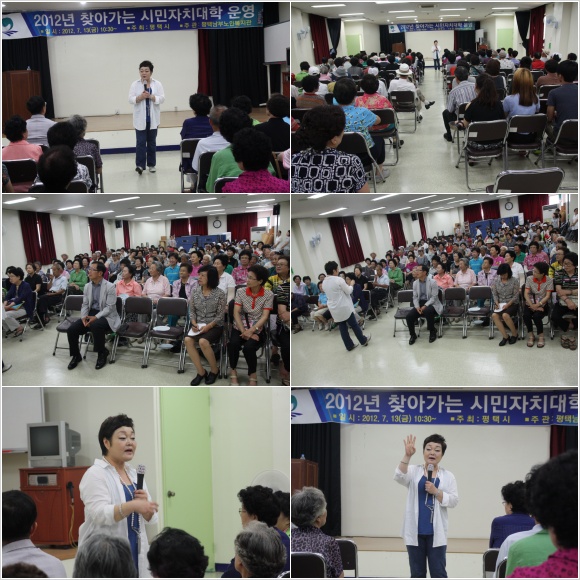 평택남부노인복지관은 평택시청에서 지원하는 무료 공개강좌 “찾아가는 시민자치대학”을 실시하였습니다. 이는 복지관 이용자에게 수요자 중심의 맞춤형 평생학습 기회 제공으로 배움이 넘치는 풍요로운 복지관, 어르신의 건강한 삶을 위하여 요리연구가이자 방송인 ‘빅마마’ 이혜정 강사를 초청하여 ‘이혜정의 건강한 식탁’이라는 주제로 복지관 이용어르신 150명을 대상으로 강의가 진행되었습니다. 이혜정 강사는 현재 서울예술전문학교 외식조리학과 학과장으로 재직하고 있으며, 미래사회교육개발원 객원강사로도 활동하면서 건강을 위하여 요리 연구가로도 활동하고 있습니다. 저서로는 ‘빅마마 꽃이 피었습니다(2010)’,‘빅마마의 쿠킹 다이어리(2005)’외 다수가 있습니다. 이번 강연을 통해 가족의 건강을 위한 1인3역의 역할 중요성을 강조하며, 요리연구가로 터닝 포인트 한 자신의 이야기와 다양하고 몸에 좋은 요리법, 요리궁합 등을 들려주면서 어르신들의 많은 호응을 얻었습니다. 이에 강연에 참석한 어르신들은 요리가 가족 사랑을 실천할 수 있는 계기가 되고, 이를 통해 건강한 가정, 행복한 가정을 일궈 어르신들의 건강한 노후가 될 수 있는 좋은 시간이었다고 이구동성으로 말씀하셨습니다. 이후 강연을 마치고 나가는 요리연구가 이혜정 강사에게 뜨거운 환호와 감사의 박사를 보내며 2012년 한여름의 무료공개강좌를 마쳤습니다. 그리고 무료공개 강좌를 지속적으로 지원해주는 평택시청 관계자분과 미래사회교육개발원, 오늘 열정적으로 강의 해 준 요리연구가 이혜정님에게 진심으로 머리숙여 감사드립니다.