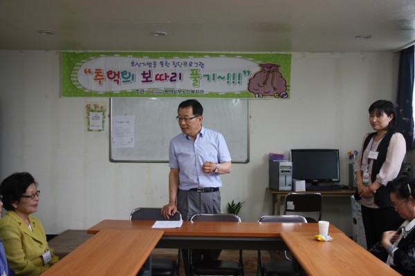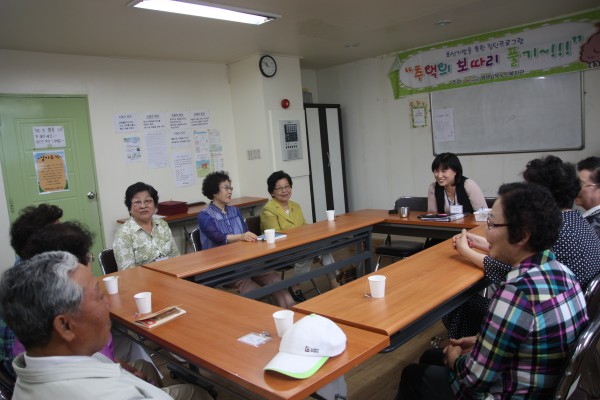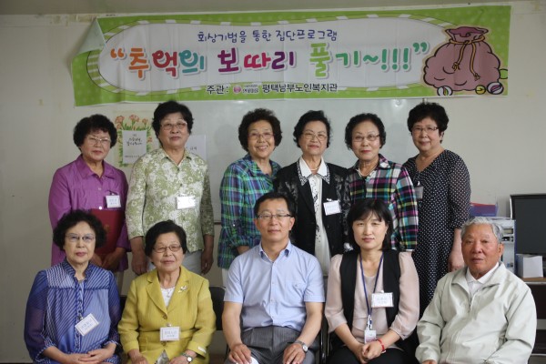 ■ 내용: 장정희 상담사의 진행으로 12회기에 걸쳐 진행되어진 "추억의 보따리 풀기!" 집단상담 프로그램은 옛 추억을 회상하면서 동년배들과 이야기를 나눔으로써 자아통합감을 향상시키는 집단프로그램입니다. 이는 5월30일(수) 수료식을 끝으로 집단상담프로그램을 마쳤습니다. 또한 이 프로그램을 마지막까지 참여하여 주신 어르신들에게 장정희 상담사의 답례품 증정식도 있었습니다. 감사합니다. 처음의 어색함이 지금은 어느새 서로의 마음을 나눌 수 있는 동년배로서 친근함과 함께 환한 미소를 기념사진 한 컷에 담아보았습니다.