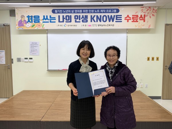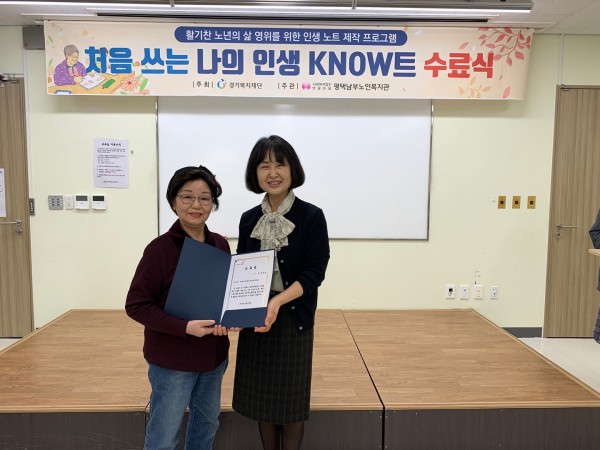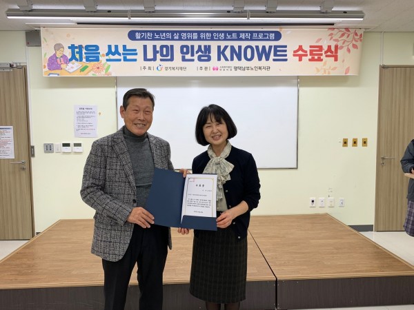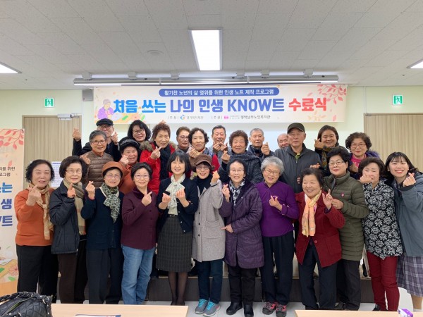 위와 같은 내용으로 진행한 어르신 인생노트 제작 프로그램 "처음쓰는 나의 인생KNOW트" 프로그램의 수료식이 11월 28일(목) 진행되었습니다! 함께해 주신 어르신들께 감사드리며,12회기 동안 좋은 강의 진행해 주신 대한웰다잉협회 김지영, 박상순 강사님께도 감사드립니다. 인생노트 프로그램은 끝났지만 어르신들의 이야기는 계속되길 바라겠습니다.
