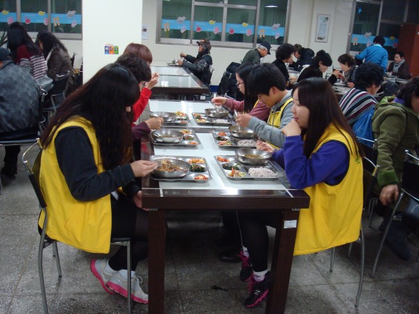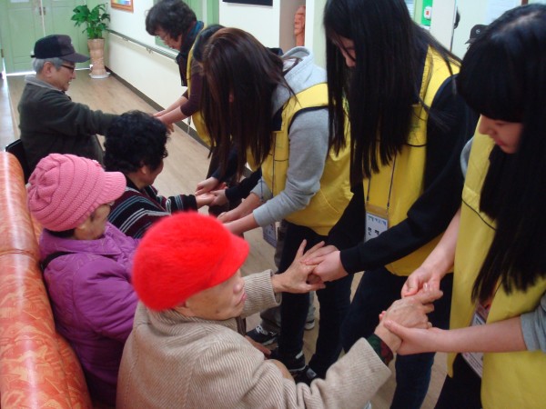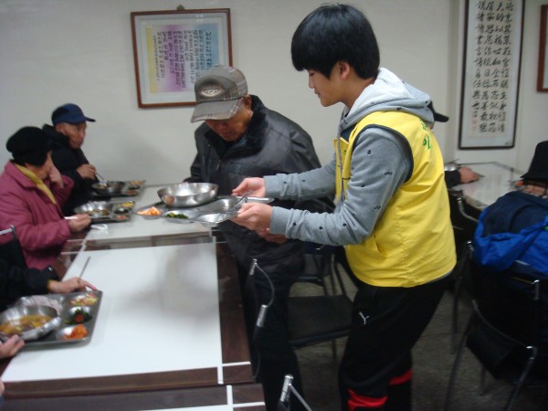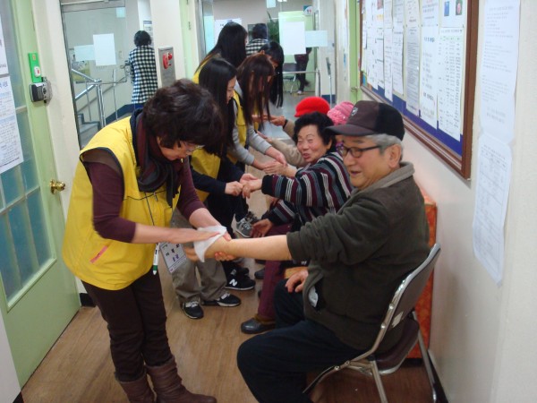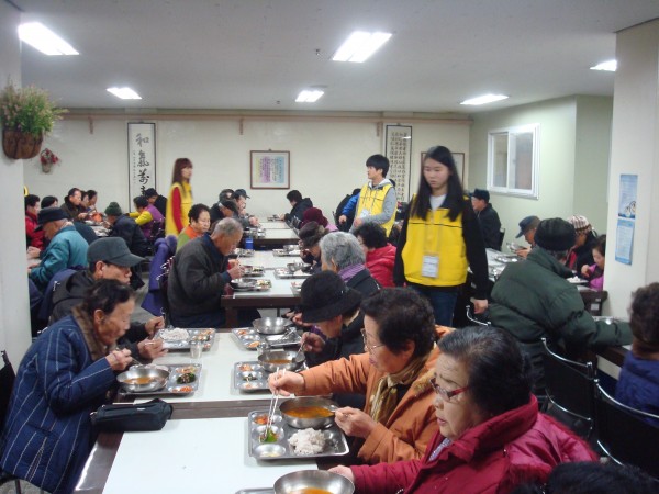 활동 내용 : 건강체조교육, 경로식당 배식 봉사 및 경로식당에서 점심 먹기, 복지관 이용 어르신들께 손, 어깨, 팔 마사지해드리기