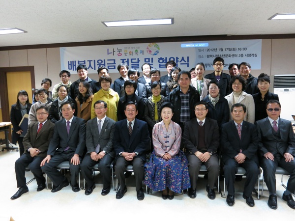 ■내용 : 평택남부노인복지관은 평택시사회복지협의회에서 주관하고 평택관내 29개 사회복지기관이 참여한 나눔문화확산운동 프로그램(걷기대회,모금이벤트,나눔문화축제)에서 독거어르신들과의 결연봉사활동인 청소년자원봉사학교 "한지붕,새가족" 프로그램이 영광스러운 1등을 한바, 1월 17일 기관장.단체장 및 협의회 임원, 사회복지관계자 60여명이 참석한 가운데 복지관장(이강희)과 협희회장(이종영)이 기금을 공정하게 배분하고 투명하게 사용하겠다는 협약식을 갖았습니다.