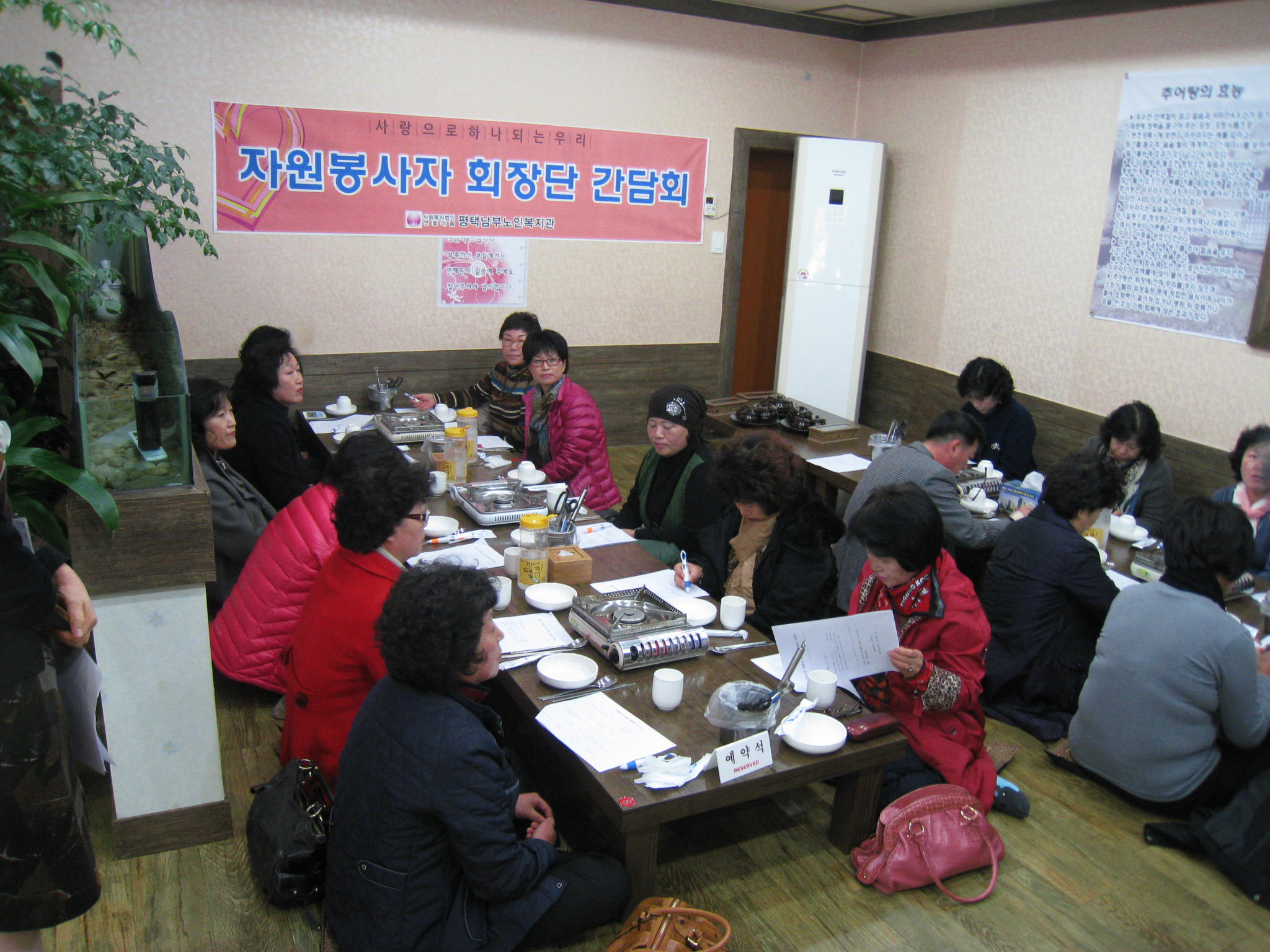 2011년 하반기 자원봉사팀 회장 간담회가 11월 30일 11:00~13:00 설악추어탕에서 있었다. 2011년 봉사하면서 건의사항 및 차기년도 발전방향에 대하여 논의 하였고, 12월 17일 토요일 평택기계공고 학생식당에서 갖게 될 감사 송년회 일정에 대하여 얘기 하였다. 이 날 2012년 자원봉사 활동계획표와 감사송년회 초대장을 나누어 주었다