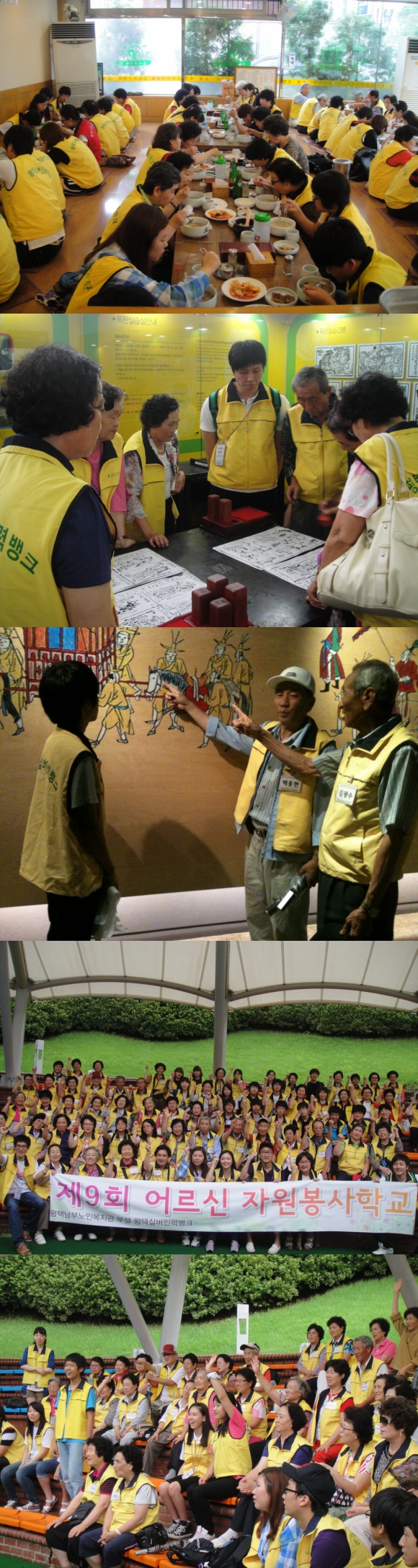 어르신자원봉사학교 네번째 시간에는 "1-3세대 소통"을 주제로 용인시에 있는 경기도박물관을 다녀왔습니다. 어르신자원봉사자 50명, 청소년자원봉사자 20명, 실습생 7명, 직원 3명이 참여하여 식사, 박물관 관람, 레크레이션 등의 활동을 진행하였습니다.