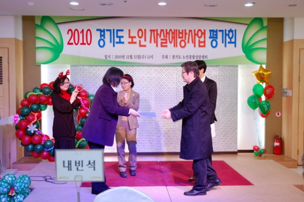 2010년도 12월 15일 자살예방사업 평가회에서 본 복지관 노인전문상담원이 고객만족상 및 우정상을 수상하였습니다. 내년에도 자살예방사업이 많은 상을 받을수 있기를 희망하면서 화 ~~이 팅