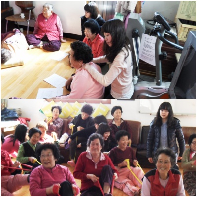 어르신들과 10학번친구들이 음악치료 및 발마사지 건강강좌등을 하여