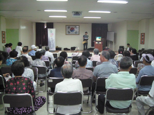 어울림 교실 시간에 뜰아래 섹소폰 동호회 회원 여러분들께서 어르신들께 무료로 공연을 해주셨습니다.