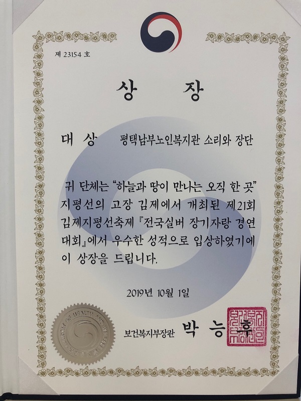 (사회교육) 2019년 21회 김제 지평선 전국 실버 장기자랑 소리와장단팀 '대상' 수상