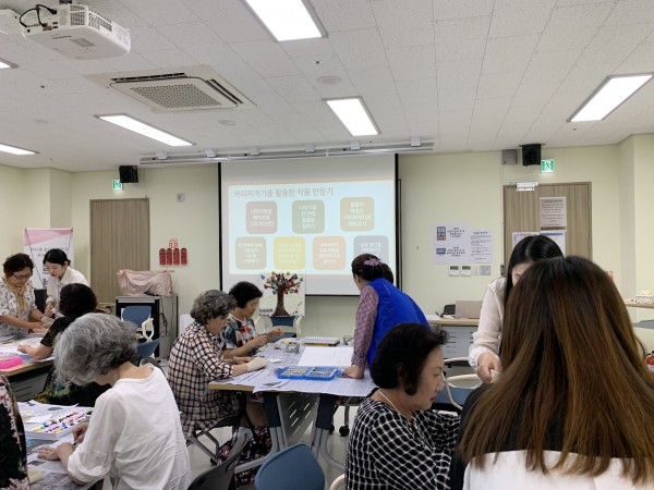 -내용: 팔찌만들기, 알이즈웰(치매예방운동), 커피찌꺼기활용 액자만들기, 캘리그라피, 티백 만들기,