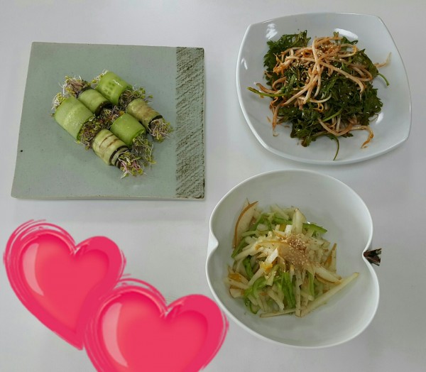 .요리교실 메뉴 : 가지새싹말이, 배오이겨자무침, 쑥갓숙주생채