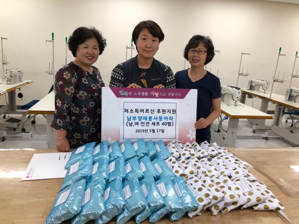 남부양재봉사동아리에서는 여름을 맞이하여 본 복지관을 이용하는 저소득 독거 어르신에게 인견 세트 40개 전달하였으며, 기부해주신 물품은 지역 어르신 복지증진에 소중히 사용토록 하겠습니다