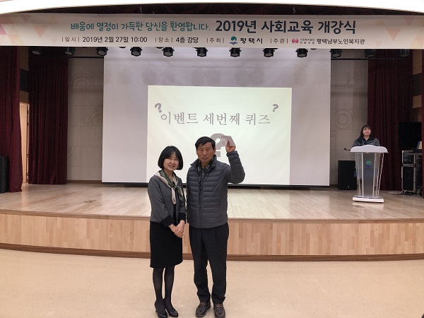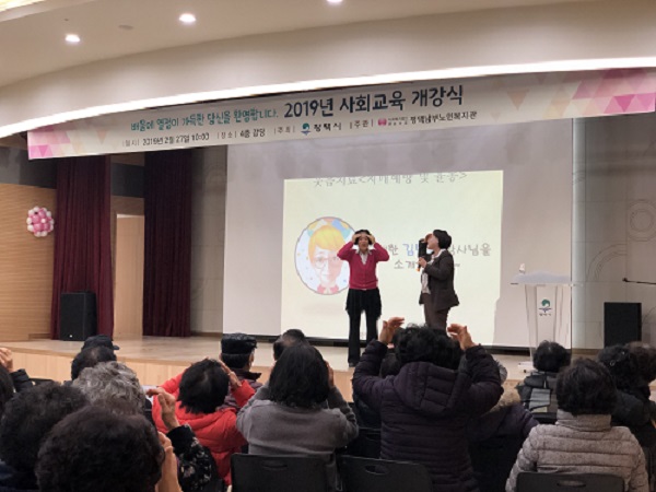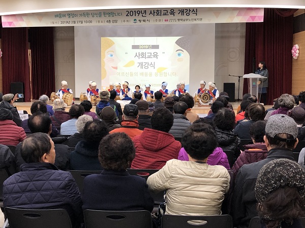 - 내 용 : 풍물반에 축하 공연으로 행사를 시작하여 관장님인사, 강사소개, 사회교육 사업에 전반적인 공지사항 전달, 라인댄스시범, 웃음치료 특강 순서로 진행하였습니다.