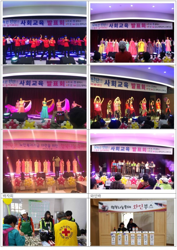 3. 내용: 후원금 전달식, 바자회, 사회교육발표회, 홍보부스(포토존, 종이접기, 할매가 간다), 음식부스, 와인바, 음악회