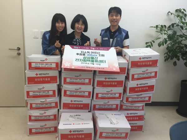 삼성물산 전자 평택 물류센터의 추석 희망 나눔 특별활동이 있었습니다. 저소득 어르신 지원 가공식품(식용류, 간장, 고추장, 밀가루등) 선물세트 30박스를 후원해주셨습니다.