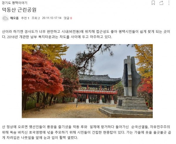 - 내용 : 덕동산을 덕동산 이용안내 시설 등 직접 사진찍고 취재하여 블로그에 업로드를 하였습니다~