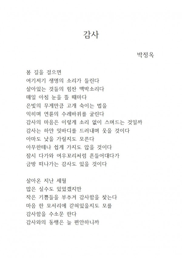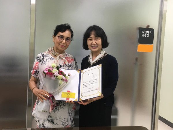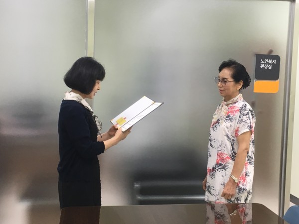 내용: 고양시일산노인종합복지관에서 주관하는 제9회 전국어르신 문학작품 공모전에서 "감사"라는 운문작품을 공모한 박정옥어르신께서 입선되어 상장을 전달하였습니다. 입선 수상을 축하드립니다.