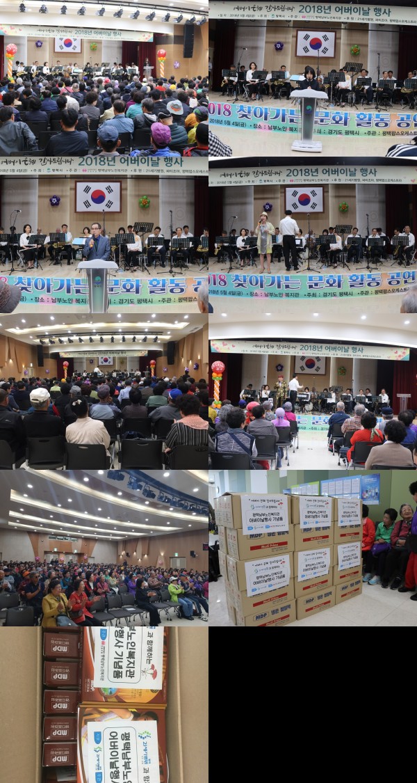 내 용: 어버이날행사를 맞이하여 5월 4일(금) 11시30분부터 무료특식을 제공하였고 13시 부터 평택팝스오케스트라에서 안동역에서, 사랑이뭐길래, 바램, 어머님 은혜 등 멋진 공연을 제공해주셔서 뜻깊은 어버이날 행사가 진행 되었습니다. 또한 어버이날행사를 맞이하여 21세기병원에서 황토찜찔팩을 후원해 주시어 참석하신 어르신에게 모두 전달해 드렸습니다. 2부행사인 5월 8일(화) 9시 부터는 이용 어르신들에게 카네이션을 달아드리는 행사를 진행하였습니다. 후원해주신 21세기 병원관계자 님과 평택팝스오케스트라 공연팀, 파티조아사장님께 감사인사드립니다.