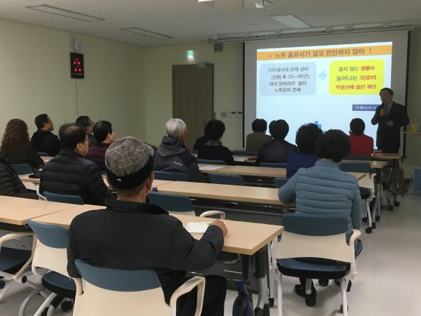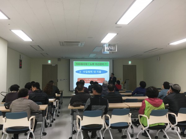 - 내 용: 2018년 금융교실 1회기를 진행하였습니다. 이정근 강사님께서 '행복한 노후생활 자산관리'라는 주제로 강연을 진행해주셨습니다. 함께해주신 22명의 어르신 모두 감사드립니다.