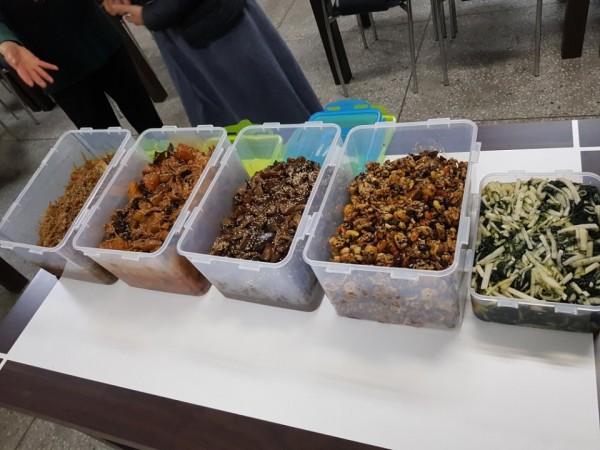 수도사에서 후원한 전통사찰음식인 두부엉조림,무 왁저지,버섯곤약조림,견과류조림,파래무침이었으며 치매예방에 특히 좋은 음식들이었다.