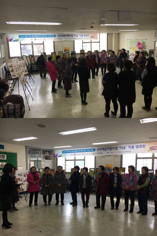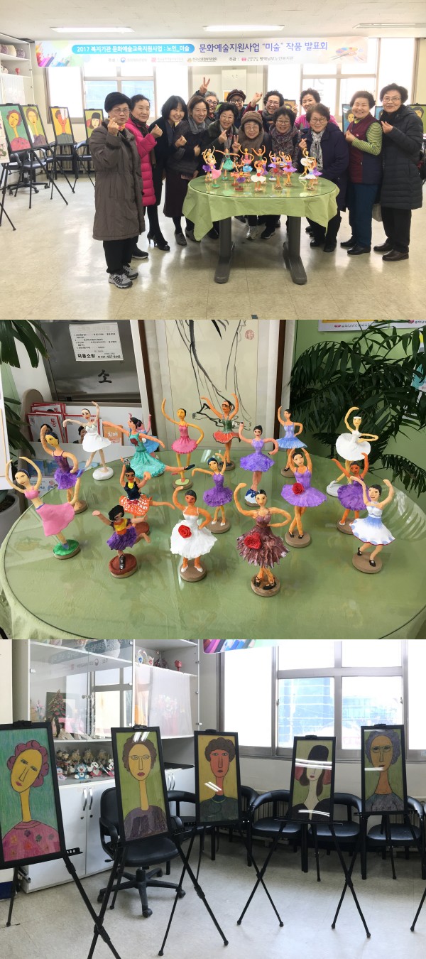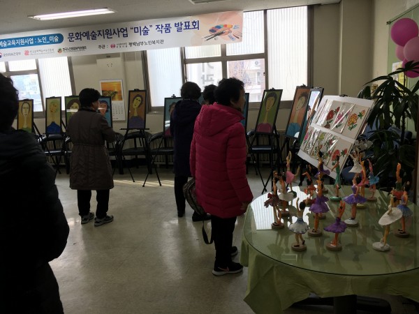 3. 내용 : 문화예술지원사업"미술"프로그램에서 한 해동안 열심히 만드신 어르신의 작품을 작품발표회를 통해 전시하였음. 추후 금요일 진행 예정인 감사송년회에 전시하여 많은 후원자, 자원봉사자님들도 어르신들의 작품을 볼 수 있도록 할 예정.