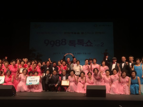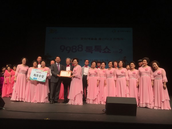 - 내 용 : 경기복지재단에서 주관하는 9988톡톡쇼 시즌2 대회 본선에서 도레미 합창반이 상금(80만원)과 함께 최우수상을 수상하였습니다. 드디어 합창반 어르신들의 노력이 결실을 맺었습니다. 많은 축하부탁드립니다.