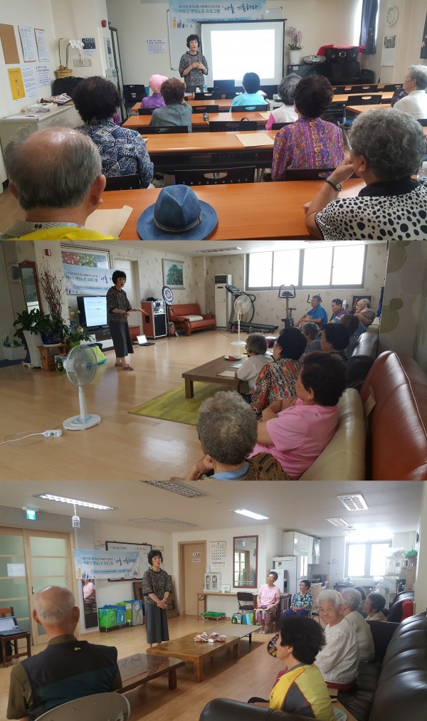 - 내용: 복지관에서는 2017년 경기도청 사회복지기금사업으로 선정된 2017년 어르신엔딩노트 프로그램을 시작하였습니다. 비전경로당과 휴먼시아2단지경로당, 그리고 휴먼시아 이곡마을 3단지 경로당에서 엔딩노트프로그램 "나를기록하다" 7회기를 진행하였습니다. 사전의료의향서 실천모임 소속 강사님을 주축으로 이루어 웰다잉교육을 진행되었습니다. 어르신들과 함께 소통하고 교류할 수 있는 시간이었습니다. 어르신 엔딩노트는 경기도청에서 지원하여 경로당어르신들과 엔딩노트를 작성하는 프로그램입니다. 이번 교육은 12회기의 웰다잉교육과 8회기의 엔딩노트작성하는 시간을 가지는 프로그램입니다.