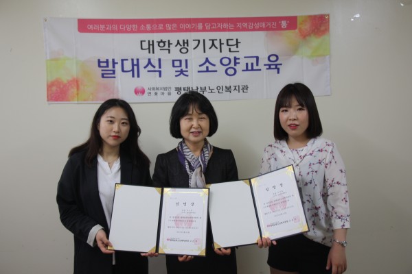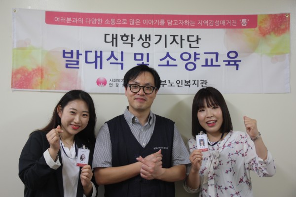 - 내용 : 복지관에서는 소식지 'Tong' 제작을 위하여 2017년 대학생 기자단 발대식 및 소양교육을 진행하였습니다. 임명장 전달 및 관장님의 아낌없는 조언과 그리고 인터뷰 진행방법(인터뷰시 주의사항) 및 사진촬영기법에 대해서 교육을 받았습니다. 앞으로 신규 대학생 기자단학생의 열정적인 활동을 기대하며 2017년 통 소식지에 많은 관심부탁드립니다.