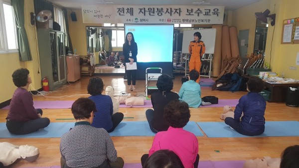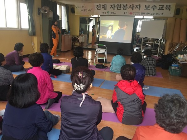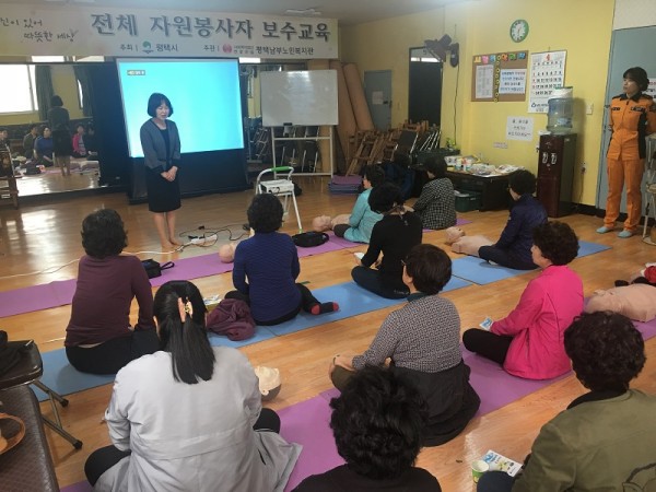 - 내용: 복지관 정기 지원봉사자 16명을 대상으로 1차 자원봉사자 보수교육을 진행하였습니다. 생활속에서 발생할 수 있는 응급상황에 대한 대처 교육을 이론과 실습을 통해 배우는 시간을 가졌습니다. 교육에 참여해 준 자원봉사자님과 교육을 진행해준 평택 소방서 교육팀에 감사말씀 드립니다.
