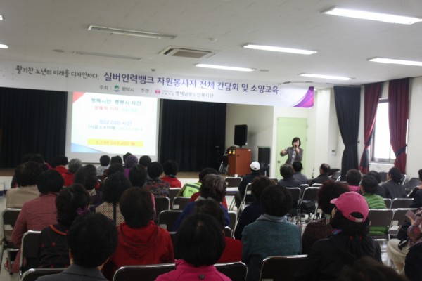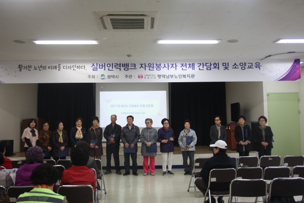 2017년 어르신 자원봉사 전체 간담회 및 소양교육이 실시되었습니다. 리더 임명 및 사업소개가 진행되었고, 평택시 자원봉사센터 홍음희 국장님의 자원봉사 실천 사례를 중심으로 소양교육이 진행되었습니다.