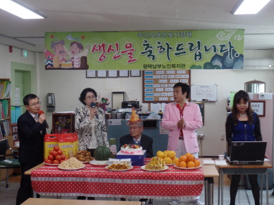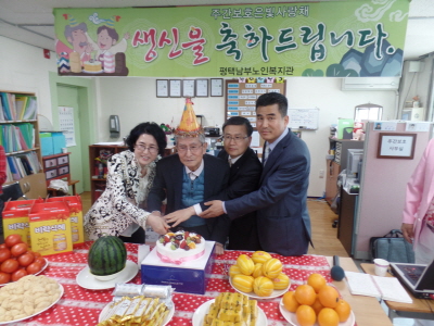 내용: 평택남부노인복지관 부설 주간보호센터에서는 황철현 어르신의 생신잔치를 실시하였습니다. 어르신 가족분과 함께 즐거운 생신잔치를 진행하였습니다.